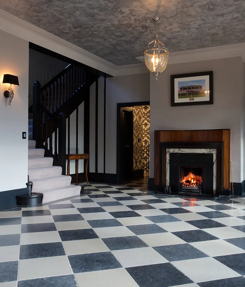 The Tora Blue Limestone, with its inky-black hue and delicate off-white fossils, evokes the timeless elegance of a French château. These tiles, with a tumbled finish, soften the stone's natural beauty, creating an inviting and refined atmosphere.